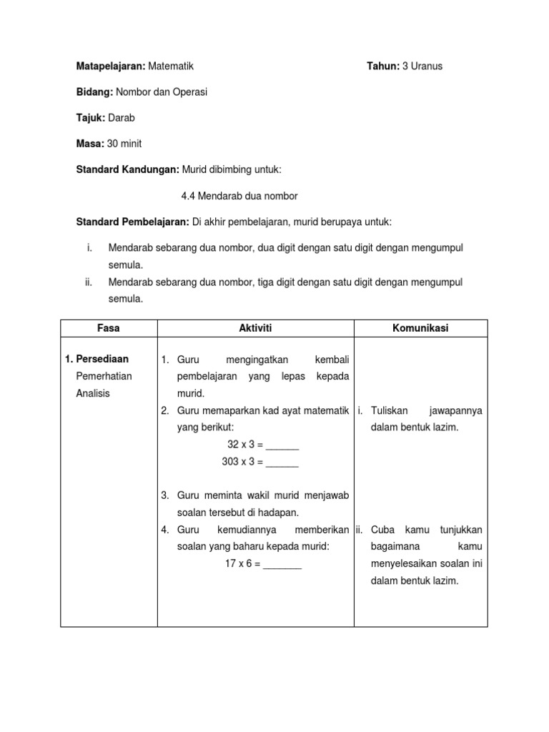 Rph Matematik Kssr Tahun 3 Mendarab Mgumpul Semula Pdf