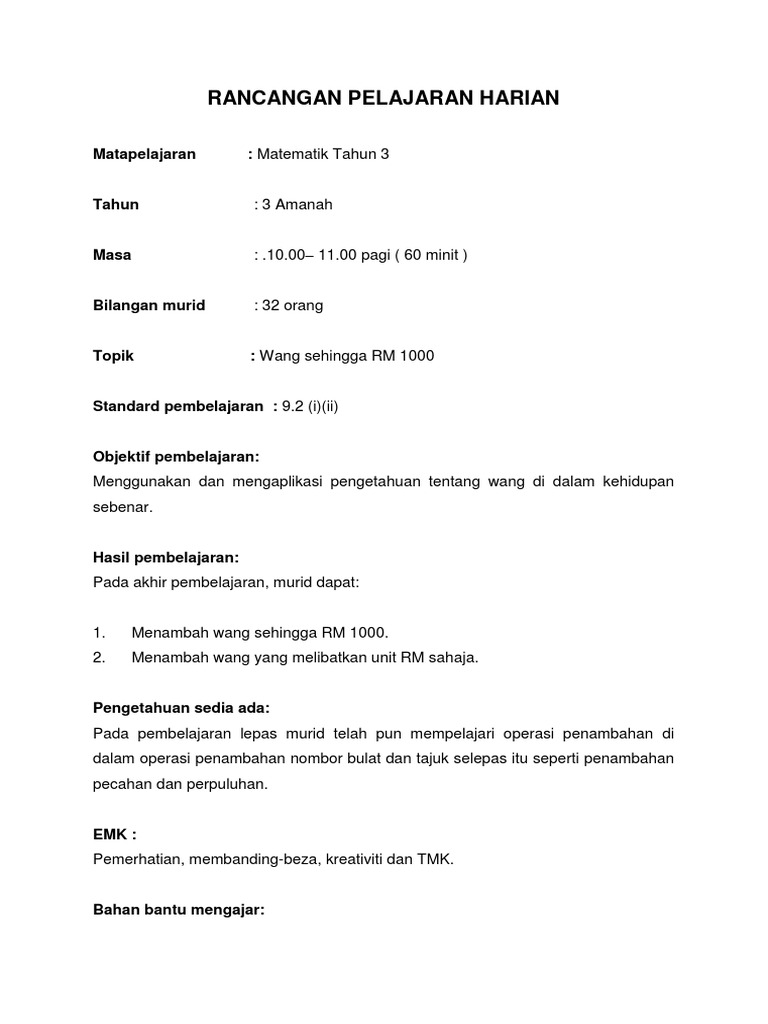 Oleh itu saya telah memilih untuk mengajar subjek Matematik bawah tajuk Mata Wang. 1Guru menunjuk gambar dan contoh jam. RPH Matematik Tahun 1 adalah Rancangan Pengajaran Harian yang perlu disediakan lebih awal oleh guru sebelum menjalankan sesi pegajaran dan pembelajaran.